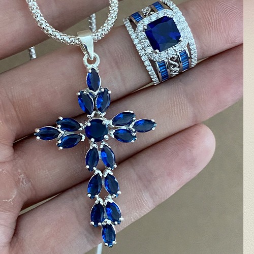 Sterling silver Amelia design blue tanzanite cubic zirconia cross pendant 55mm long quantity